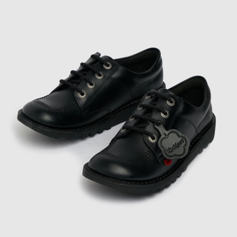 Kickers don't get much more practical than the Kick Lo. Arriving for Kids^Footwear, this black leather lace-up features triple stitch details and iconic green/red tab branding for a stamp of authenticity. A chunky rubber sole ensures a durable finish.