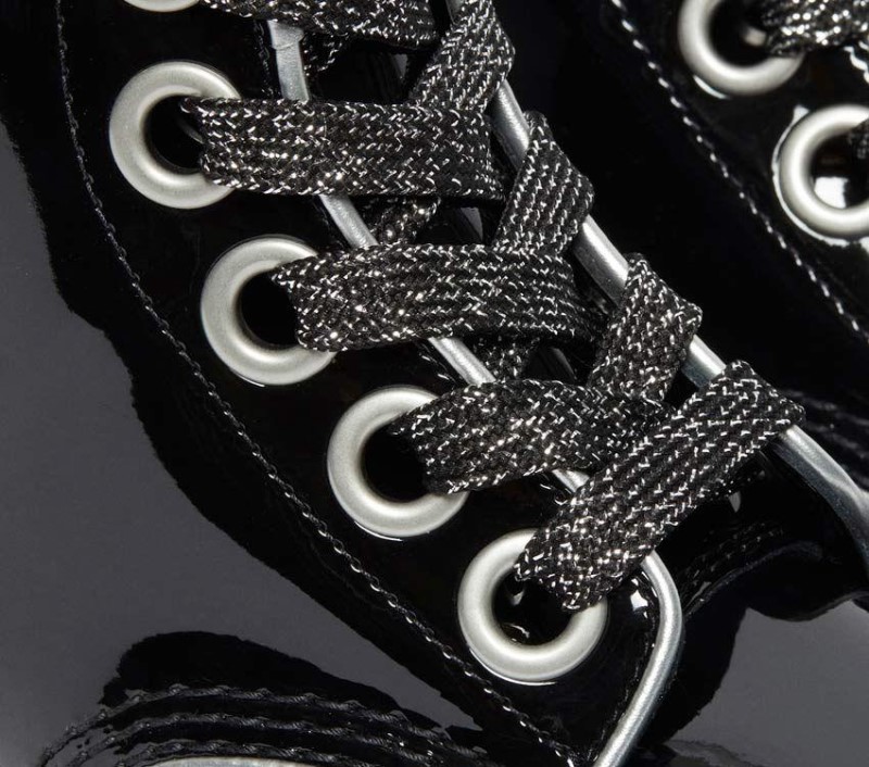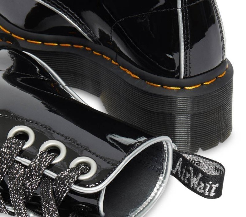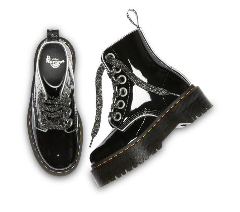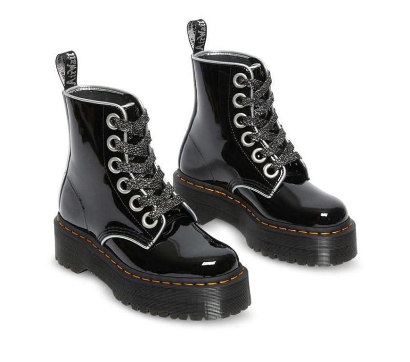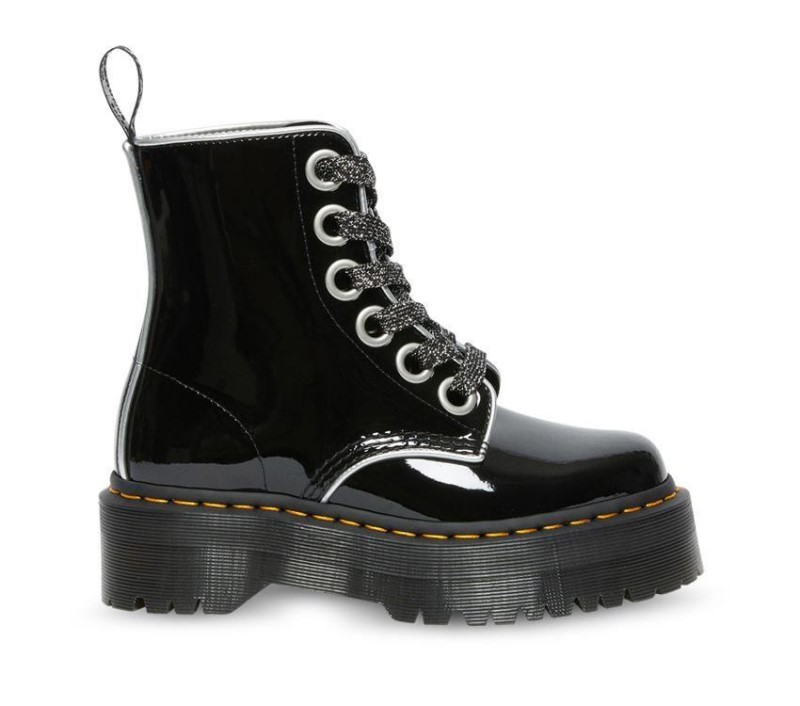 Our Molly boot has been given a high-shine, high impact upgrade. Stacked on a 1.85窶・sole, the boots are loaded with DM窶冱 spirit and detailed with classic markings like our yellow welt stitching. Made with silver Alumix binding on Patent leather and finished with nickel eyelets and silver lurex accents in the heel loop and laces. Free return.