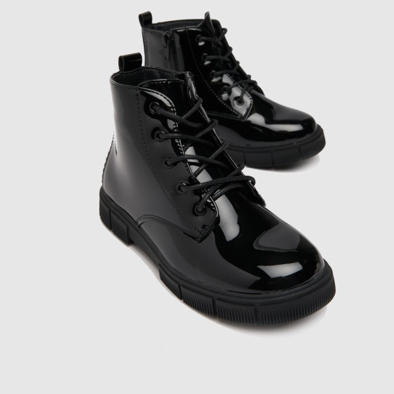 The Chant Lace Boot from schuh arrives in junior sizes. Featuring a sleek black patent upper with a chunky rubber outsole for durability. A memory foam sock liner ensures ultimate comfort, pair with any new season fit to keep those little feet smart.