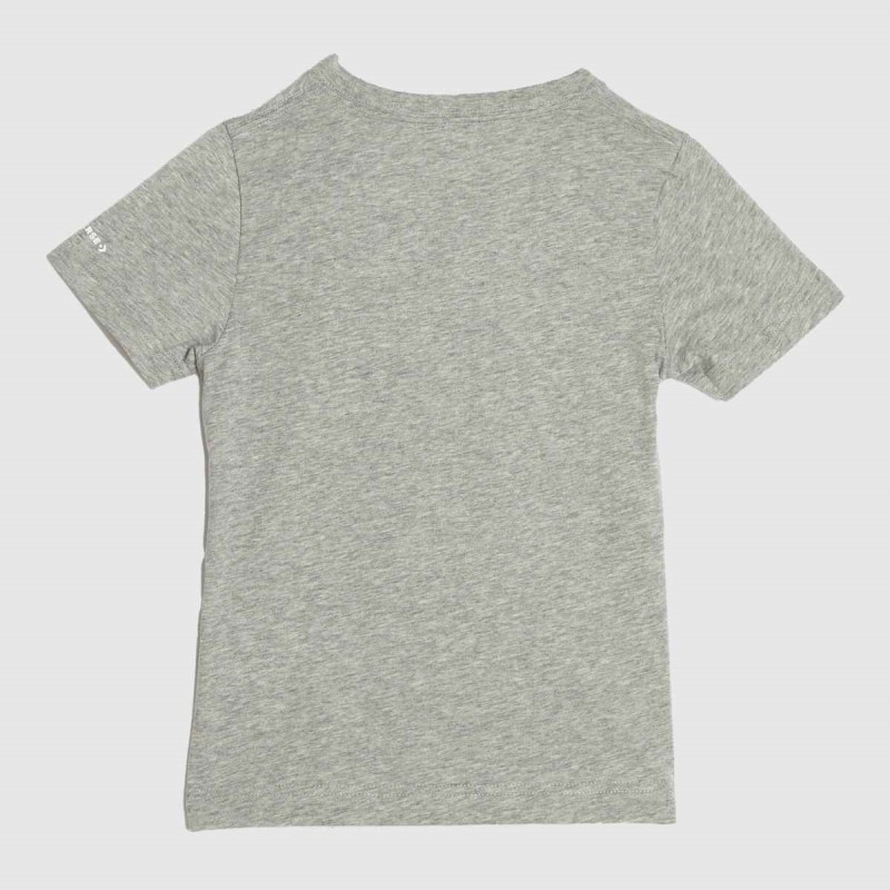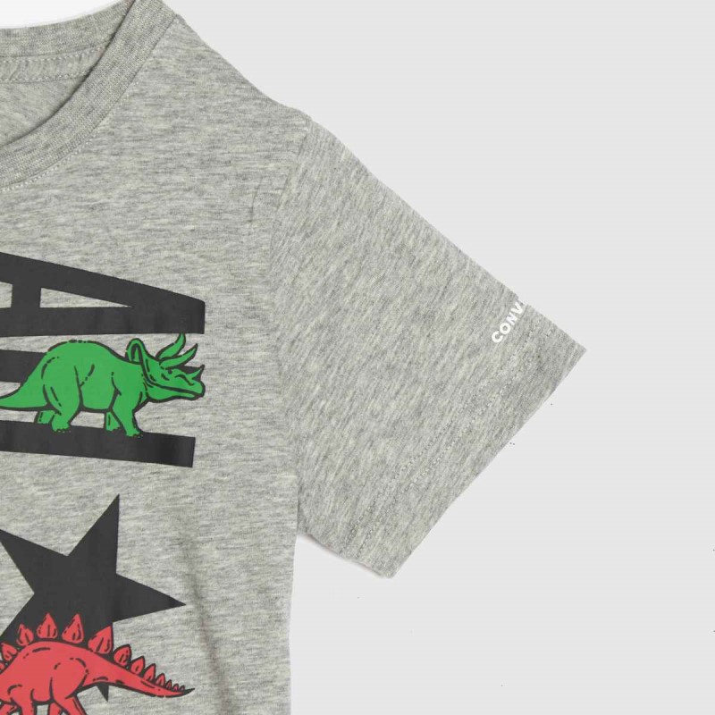 The Converse Boys Dinoverse Vertical All Star T-Shirt is made for your kids' wardrobe, trust us! Arriving in a light grey soft and comfortable fabric with black branding and colourful dinosaurs.