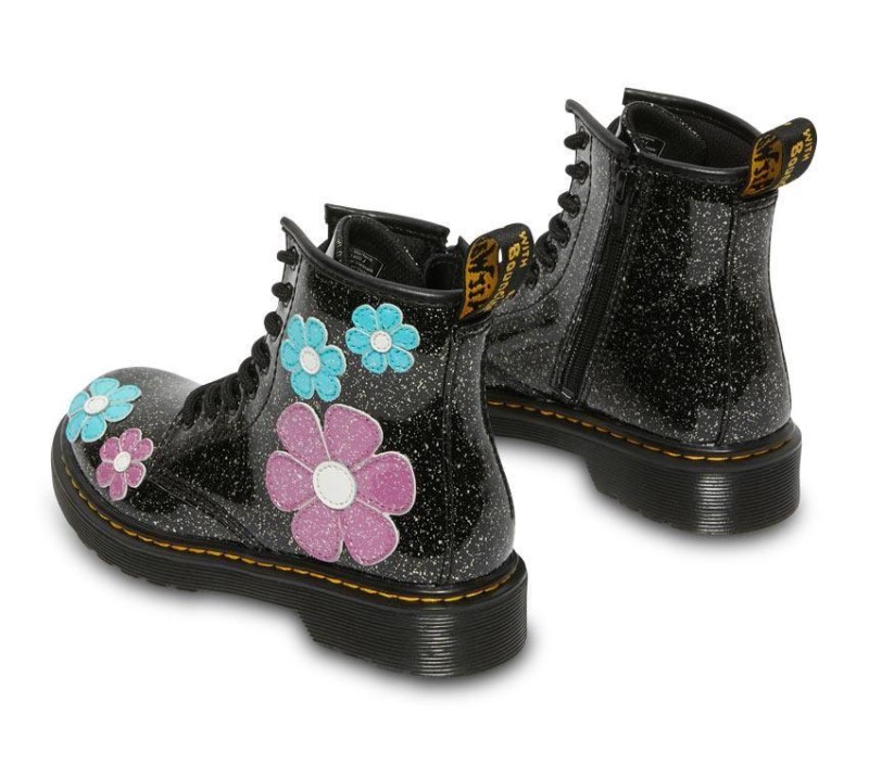DM窶冱 Cosmic Glitter junior boots with added Patent Lamper leather flowers. As much fun to wear as they are to look at. Built with all the care and craft that DMs has perfected for over 60 years. An inner zip keeps it easy to get on and off. Dr.Martens boots NZ