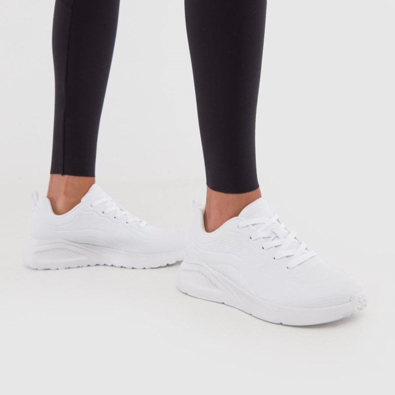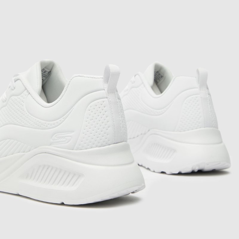 Shape up your new season look with the SKECHERS Bobs Sport Buno! This sporty trainer is crafted from a sleek while man made upper paired with an Air Cooled Memory Foam insole and a real lightweight silhouette that's perfect for all day wear.