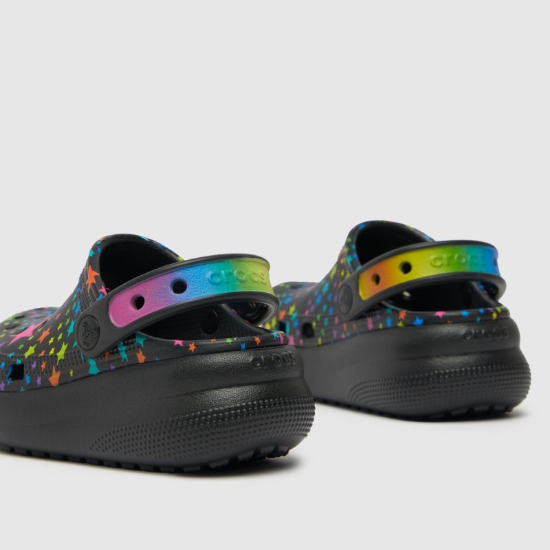 Classic clogs...with a twist. The junior crocs Classic Cutie Disco Clog boasts a black man-made upper with multicoloured star detailing throughout, sat on a thick outsole keeping with the trends. Lot's of fun for those little feet, cop them now!