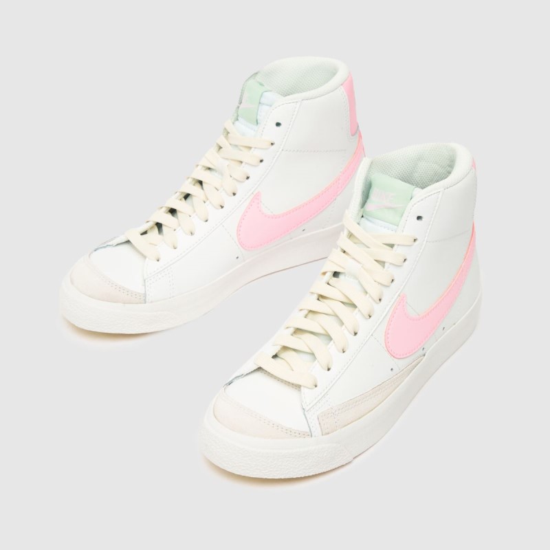 Bring that old school basketball vibe home with this Nike Blazer Mid 77 youth. With a white leather upper and cute pale pink Swoosh, this mid top sneaker is complete with vintage details to make it look like you've had them for years.